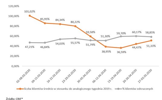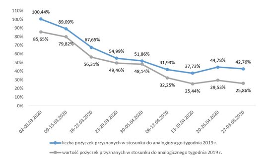 Najnowsze dane CRIF i BIK uwzględniają cztery pełne tygodnie obowiązywania obniżonych kosztów pozaodsetkowych. Niemal stała tendencja spadkowa wartości oraz liczby udzielanych pożyczek przez firmy z branży widoczna jest już jednak od prawie dwóch miesięcy. Według danych CRIF w drugiej połowie marca 2020 r. wartość udzielanych pożyczek spadła w stosunku do średniego tygodnia lutego o ok. 40 proc., natomiast w stosunku do analogicznego okresu roku poprzedniego o ok. 50 proc. W całym kwietniu spadek wartości udzielonych pożyczek wyniósł 72 proc. w stosunku do kwietnia 2019 r. oraz 66 proc. w stosunku do lutego 2020 r. (ostatni miesiąc nietknięty kryzysem wynikającym z COVID-19). Odnotowano także istotny spadek liczby udzielonych pożyczek o około 57 proc. wobec ubiegłego roku.