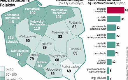 Jeśli chodzi o poziom zadłużenia, widać wyraźny podział Polski na dwie części – wynika z Indeksu Zaległych Płatności firmy BIG InfoMonitor, który poznała „Rzeczpospolita". W województwach wschodnich na tysiąc dorosłych zaległości finansowe ma od 50 do 70 osób. W centrum wskaźnik rośnie, by na zachodzie przekraczać 100 i sięgnąć aż 116 w województwie lubuskim.