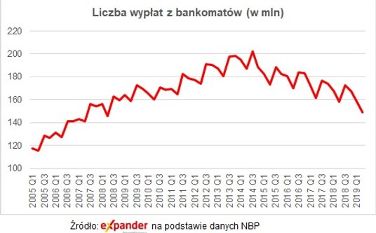 Z najnowszych danych NBP wynika, że w I kwartale 2019 r. wykonaliśmy 149 milionów wypłat z bankomatów. Może się wydawać, że to dużo, ale w rzeczywistości to najmniej od 11 lat. Expander przypomina, że ostatnio liczba bankomatów maleje, ale i tak jest ich dwa razy więcej niż w latach 2007-2008. Oznacza to, że średnio jedna maszyna jest teraz znacznie rzadziej wykorzystywana.