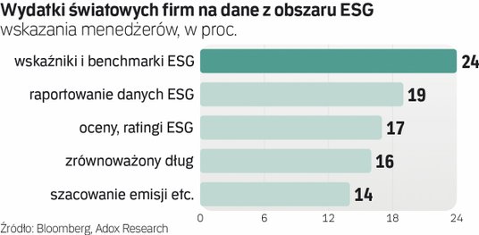 W przeprowadzonym wiosną tego roku sondażu Bloomberg i firmy badawczej Adox Research 92 proc. kluczowych menedżerów pracujących na co dzień z danymi zakładało w 2023 r. wzrost wydatków na wskaźniki i dane dotyczące ESG, które pokazują podejście firmy do ochrony środowiska naturalnego i klimatu, kwestii społecznych i ładu korporacyjnego. Co trzeci z badanych przewidywał tu ponad 20-proc. wzrost, a co piąty mówił o zwiększeniu tego budżetu o co najmniej 50 proc. Prawie połowa tegorocznych wydatków miała być przeznaczona na przygotowanie wskaźników i benchmarków ESG, a także na zbieranie w firmie i opracowywanie wysokiej jakości danych z tego obszaru.