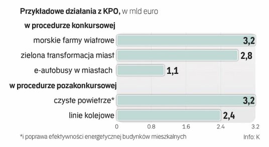 Prace nad systemem, który określi, na jakich dokładnie zasadach ma być wdrażany Krajowy Plan Obudowy, jeszcze trwają i poznamy je za kilka miesięcy. Jednak Ministerstwo Funduszy i Polityki Regionalnej szacuje wstępnie, że ok. 60 proc. alokacji z KPO będzie rozdzielone w konkursach, a ok. 40 proc. – w trybie pozakonkursowym. Całe KPO to 35,4 mld euro, więc mowa o podziale w proporcjach odpowiednio ok. 21,2 i 14,2 mld euro.