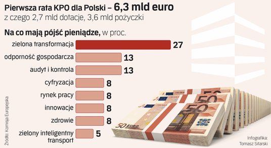 Wszystkie te pieniądze były zablokowane od 2021 r. z powodu łamania praworządności przez rząd PiS. Już przeprowadzone zmiany i zobowiązanie się rządu do przeprowadzenia kolejnych skłoniły Brukselę do zmiany stanowiska. Pierwsze 6,3 mld euro z KPO dotrze do Polski na początku kwietnia, gdy decyzja o zaakceptowaniu wniosku o płatność zostanie formalnie podjęta przez unijną Radę, a potem zamieniona na umowy operacyjne umożliwiające wypłatę pieniędzy. W tym roku Polska zamierza złożyć jeszcze dwa wnioski o płatności, w sumie chcemy dostać w 2024 roku 23 mld euro. Całość KPO to 59,8 mld euro, z czego 25,3 mld euro to dotacje, a 34,5 mld euro tanie pożyczki, do wydania do końca 2026 roku.