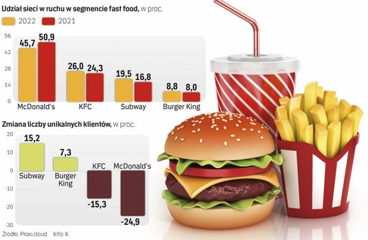 Z analizy ruchu w ponad 1 tys. największych lokali fast food od kwietnia do października wynika, że tylko Subway zanotował wzrost liczby wizyt, i to jedynie o 1,5 proc. Pozostali, jak McDonald’s, Burger King czy KFC, tracą od 2,6 do 21,1 proc. – wynika z danych Proxi.cloud, które „Rzeczpospolita” publikuje pierwsza.