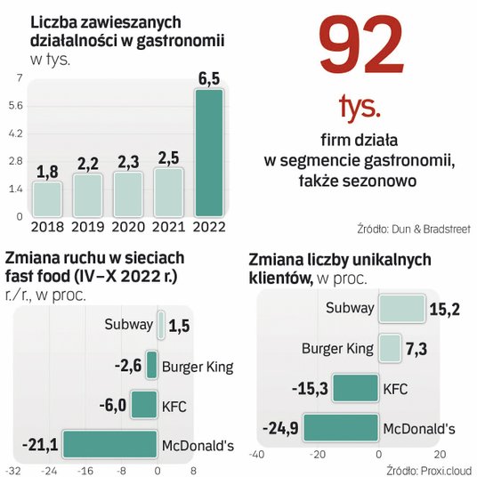 Z danych wywiadowni Dun & Bradstreet przygotowanych dla „Rzeczpospolitej” wynika, że w 2022 r. gwałtownie wzrosła liczba zawieszanych działalności gastronomicznych. – To blisko 6,5 tys. punktów, co w porównaniu z końcem 2021 r. stanowi blisko 260-proc. wzrost – mówi Tomasz Starzyk, rzecznik Dun & Bradstreet. – Blisko 2/3 branży gastronomicznej jest w słabej kondycji finansowej. Jednocześnie aż 56 proc. badanych restauracji jest w kondycji raczej słabej i 12 proc. w bardzo złej – dodaje.