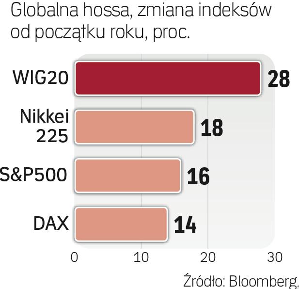 Na światowych parkietach hossa trwa w najlepsze. Indeksy w USA właśnie notują nowe historyczne szczyty. Wieloletnie rekordy wyznaczają też giełdy azjatyckie. W ostatnich kwartałach bardzo dobrze radzi sobie indeks MSCI Emerging Markets, grupujący rynki wschodzące. WIG20 jest bliski pokonania tegorocznego szczytu hossy.