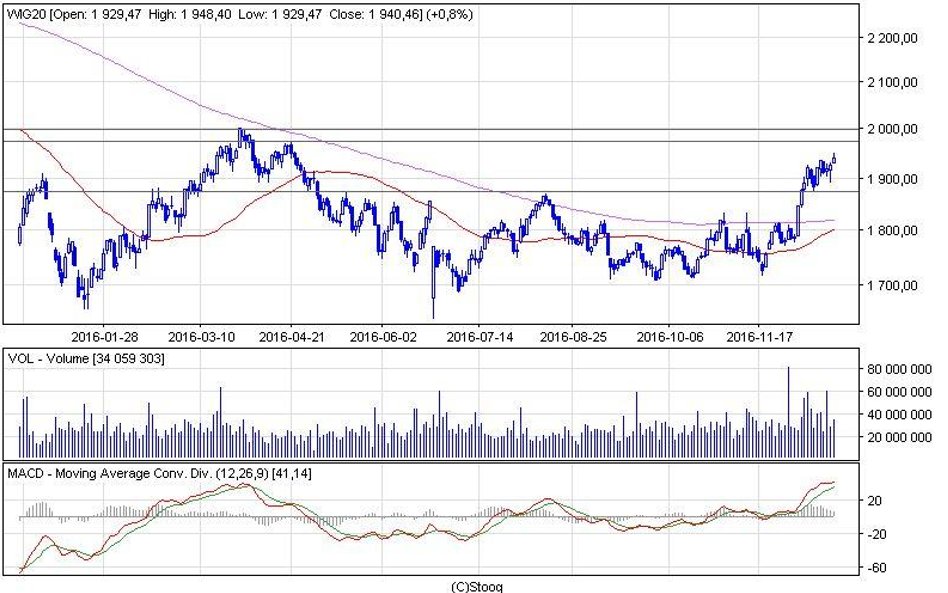 Nowy rekord trwającego od kilku tygodni rajdu oraz wybicie z kilkusesyjnej konsolidacji to techniczne sygnały kupna. Celem na najbliższe dni jest przebicie 1950 pkt, a później ruch do okrągłego pułapu 2000 pkt. Taki scenariusz jest całkiem realny, nie tylko z uwagi na utrzymujące się ostatnio dobre nastroje na globalnych rynkach akcji, ale również w świetle historycznych statystyk. - Rajd św. Mikołaja obejmuje tylko sesje między świętami Bożego Narodzenia, a Nowym Rokiem. Anomalia ta wynika głównie z tego, że zarządzający funduszami starają się wtedy, na mało płynnym rynku, poprawić swoje wyniki. Średnio okres ten przynosi wzrost WIG o 2,5 proc., a relacja zysk ryzyko wynosi 3. Jak dotąd w 80 proc. przypadków ten rajd się pojawiał. Tylko w czterech latach go nie było – przekonywał w jednym z listopadowych programów #PROSTOzPARKIETU Łukasz Bugaj, analityk DM BOŚ.