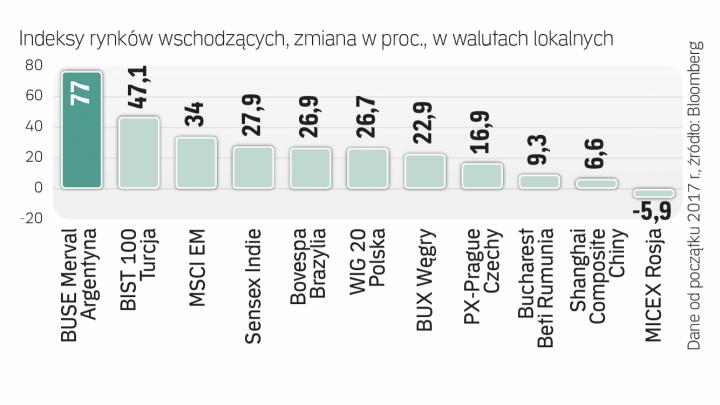 Na drugim miejscu znalazł się argentyński indeks Merval, który wzrósł o 77 proc., a na trzecim kijowski Ukrainian Equities ze wzrostem wynoszącym 71 proc. Plasowały się za nim: mongolski MSE Top 20 (+66,5 proc.), kazachski KASE (+60 proc.) oraz indeks chińskich akcji MSCI China, który zyskał 52 proc.