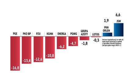 Grupa Azoty | Państwo jest w posiadaniu 33 proc. udziałów. 600 mln zł wynosi spadek wartości rządowych udziałów w koncernie chemicznym. Łącznie wszyscy akcjonariusze od czasu tuż przed ostatnimi wyborami prezydenckimi do dziś stracili na swoich akcjach 1,8 mld zł. Obecna kapitalizacja firmy sięga 6,23 mld zł, czyli 77 proc. wartości z maja 2015 r. Na wypłaconą w tym roku dywidendę zarząd przeznaczył prawie 84 mln zł.