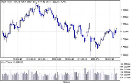 WIG20 rozpoczął czwartkową sesję od lekkiej zwyżki. Po kwadransie notowań kurs indeksu rósł o 0,6 proc. do 1800 pkt. Przy tym poziomie wskaźnik blue chips pozostał do godziny 13-stej. To wtedy poznaliśmy decyzję brytyjskich władz monetarnych dotyczącą stóp procentowych. Po raz pierwszy od siedmiu lat stopy zostały obniżone – o 25 pkt bazowych do 0,25 proc. Ponadto Bank Anglii postanowił rozszerzyć program skupu aktywów QE do 435 mld i uruchomić program skupu obligacji korporacyjnych o wartości 10 mld GBP w ciągu 18 miesięcy.