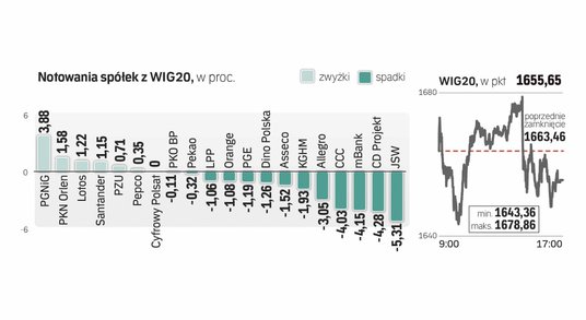 Największe krajowe spółki notowane w Warszawie w trakcie wtorkowej sesji radziły sobie ze zmiennym szczęściem. Mimo przewagi negatywnych nastrojów na rynku w Warszawie część spółek z indeksu WIG20 wybroniła się przed spadkami. Na celownik kupujący wzięli walory PGNiG i rafinerii, których akcje podjęły udaną próbę odrobienia strat po dwóch dniach solidnej przeceny. Na drugim biegunie znalazły się papiery koncernów wydobywczych JSW i KGHM. Biorąc pod uwagę dynamicznie zniżkujące ceny miedzi (25 proc. od początku bieżącego roku) i prognozy zakładające dalszy spadek cen metalu, posiadaczy akcji miedziowego koncernu czekają trudne miesiące.