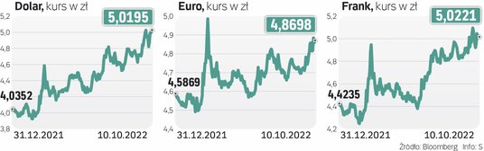 W efekcie złoty tracił na wartości względem najważniejszych walut, kontynuując negatywny trend z poprzedniego tygodnia. Za dolara znów trzeba było płacić nieco ponad 5 zł, frank szwajcarski kosztował nawet 5,04 zł, a euro wyceniane było maksymalnie po 4,88 zł. To wartości niewiele poniżej historycznych rekordów, do pobicia których brakuje zaledwie kilku lub kilkunastu groszy. Dopiero pod koniec dnia poniedziałkowe straty udało się odrobić.