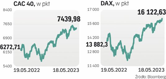 W kwietniu nowe historyczne szczyty wyznaczył francuski CAC 40, który obecnie notuje około 15-proc. zwyżkę. Do pobicia rekordu wszech czasów niewiele brakuje niemieckiemu DAX, który zyskał w tym roku o 1 pkt proc. więcej. Na finiszu czwartkowej sesji wskaźnik zwyżkował o 1,3 proc., wychodząc powyżej psychologicznej bariery 16 tys. pkt, co oznaczało, że do przełamania historycznego szczytu z listopada 2021 r. brakowało mu już tylko niespełna 1 proc. Wszystko to dzieje się przy wciąż trwającym cyklu podwyżek stóp procentowych w Europie, który ma za zadanie chłodzić gospodarkę. Przypomnijmy – w kwietniu inflacja w strefie euro ponownie przyspieszyła, sięgając 7 proc. Inwestorzy oczekują do jesieni jeszcze dwóch podwyżek stóp po 25 pkt baz. przez EBC.