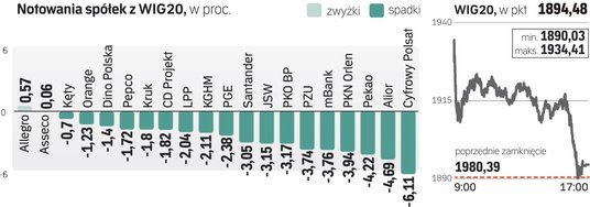 W czwartek straciły papiery niemal wszystkich największych spółek. Największa przecena dotyczyła walorów Cyfrowego Polsatu, Alior Banku i Banku Pekao, które spadły odpowiednio o 6,1 proc., 4,7 proc. i 4,2 proc. Walory telekomunikacyjnej grupy spadały przez większość sesji i nie zmieniła tego rekomendacja zarządu mówiąca o przeznaczeniu ubiegłorocznego zysku w całości na kapitał zapasowy. Kiepsko wyglądała też sytuacja firm surowcowych. Akcje PKN Orlenu potaniały o 3,9 proc., a JSW – o 3,2 proc.