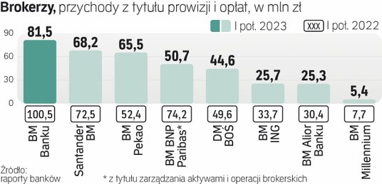 O blisko 30 proc. spadły przychody prowizyjne w BM Millennium i wyniosły one 5,4 mln zł. Blisko 24-proc. spadek, do 25,7 mln zł, zaliczyło także BM ING Banku Śląskiego. O blisko 19 proc. przychody spadły w BM mBanku. W I półroczu wpływy biura z tytułu prowizji maklerskich i za organizację emisji wyniosły 81,5 mln zł. O niemal 17 proc., do 25,3 mln zł, zmniejszyły się z kolei przychody prowizyjne w BM Alior Banku.