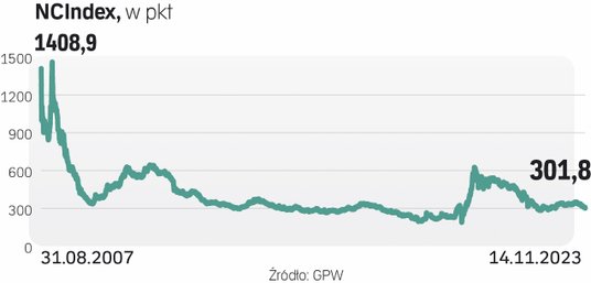 Od początku 2023 r. WIG zyskał ponad 1/4. We wtorek poszedł w górę o ponad 4 proc. Do rekordu sprzed dwóch lat (75 tys. pkt) brak mu niespełna 1 proc. Inaczej wygląda sytuacja na rynku alternatywnym. NCIndex od początku roku stracił 4 proc., a licząc od tegorocznego maksimum (28 lipca; 350 pkt) – ponad 14 proc. We wtorek zniżkował prawie 1 proc., spadając poniżej 300 pkt. Po południu miał wartość 299,48 pkt. Biorąc pod uwagę wartości z zamknięcia, to najniższy poziom od 21 grudnia 2022 r.