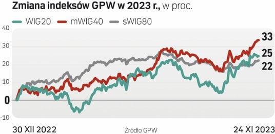 W ocenie Świniarskiego można oczekiwać, że w 2024 r. do hossy dołączą mniejsze spółki. Siłą napędową zwyżek w tym segmencie rynku mogą być krajowe fundusze, ale i skuszeni atrakcyjnymi stopami zwrotu inwestorzy indywidualni.