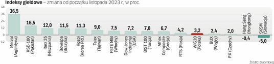 Listopad był ogólnie dobrym miesiącem dla znacznej większości rynków akcji na świecie. Spośród głównych indeksów giełdowych śledzonych przez agencję Bloomberg tylko 11 zamykało listopad na minusie, a jedynie w przypadku sześciu z nich przecena była większa niż 1 proc. Dobrze sobie radziła polska giełda. WIG 20 zyskał ponad 3 proc., a WIG blisko 4 proc. Urosły więc one bardziej niż większość indeksów giełdowych z naszego regionu. Na tle świata nie były to jednak zwyżki imponujące. Plasowały one WIG 20 dopiero w piątej dziesiątce najlepszych indeksów giełdowych listopada.