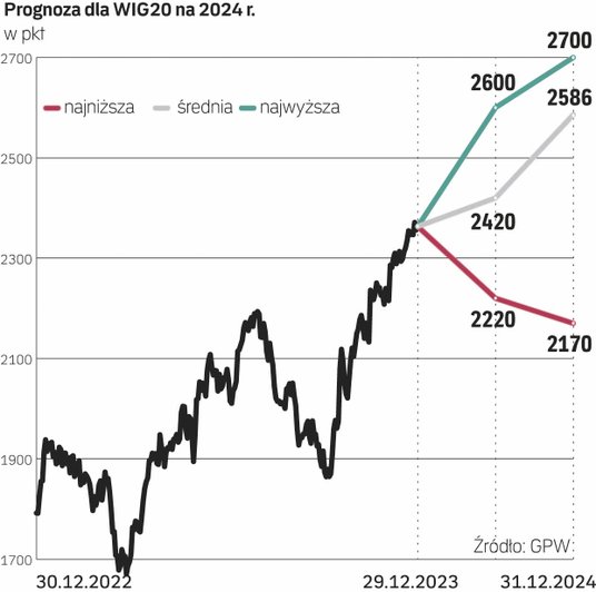 Po bardzo udanym dla inwestorów 2023 r. eksperci liczą, że hossa na naszej giełdzie się utrzyma, co będzie w dużej mierze wynikać z dobrej koniunktury na zagranicznych giełdach, poprawy otoczenia makroekonomicznego i pozytywnego nastawienia zagranicznych inwestorów do polskich akcji, czemu dodatkowo sprzyjać powinny atrakcyjne wyceny krajowych firm. – Mimo dużych zwyżek na GPW w 2023 r. wszystko wskazuje na to, że hossa ma szansę na kontynuację w 2024 r. Zaryzykowałbym nawet stwierdzenie, że krajowy rynek akcji, pomimo silnych wzrostów w ostatnich 12 miesiącach, ma większe szanse na zauważalną, dwucyfrową w skali roku stopę zwrotu w porównaniu z rynkami bazowymi. Różnica wynika z dwóch powodów. Po pierwsze, krajowy rynek akcji od listopada 2022 r. do grudnia 2023 r. osiągnął naprawdę zachwycającą stopę zwrotu. Jednak na przykład indeks dużych spółek w momencie startu znajdował się na poziomie bliskim dołkom z pandemii 2020 r. A tego nie można powiedzieć o indeksach na rynkach bazowych. Drugim argumentem przemawiającym za wzrostami na naszej giełdzie są wciąż umiarkowane wyceny akcji, co sugeruje, że możliwe jest dołączenie do hossy również mniejszych spółek – wskazuje Kamil Hajdamowicz, menedżer ds. ryzyka produktów inwestycyjnych w Santander Bank Polska. Jego zdaniem jeszcze w I kwartale 2024 r. indeks największych firm WIG20 ma szanse dojść do poziomu 2500 pkt. Dalszy rozwój sytuacji zależeć będzie od takich czynników, jak perspektywy gospodarki, globalna polityka monetarna czy czynniki polityczne, w tym nadchodzące wybory prezydenckie w USA. – W tym kontekście druga połowa 2024 r. może charakteryzować się podwyższoną zmiennością, ale zakładam, że na koniec roku stopy zwrotu na krajowym rynku będą kilkunastoprocentowe – uważa ekspert.