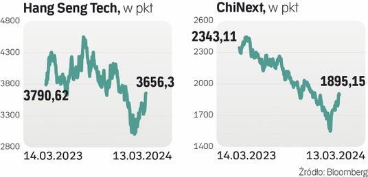 Hang Seng Tech, czyli indeks spółek technologicznych notowanych na giełdzie w Hongkongu, dołączył do grona indeksów giełdowych, które weszły w hossę. W środę był on co prawda o 3 proc. niżej niż na początku roku i o 24 proc. niżej niż w zeszłorocznym szczycie, ale od dołka z końcówki stycznia zyskał 22 proc. Pod względem technicznym wszedł więc w rynek byka. Nieco wcześniej wejść w hossę udało się indeksowi ChiNext (który jest zdominowany przez spółki technologiczne) oraz indeksowi chińskich spółek z branży energetyki odnawialnej. Hang Seng China Enterprises, czyli indeks chińskich firm notowanych w Hongkongu, jest bliski rozpoczęcia rynku byka. Od dołka zyskał bowiem prawie 19 proc. Do hossy wciąż jednak trochę brakuje głównemu indeksowi Hang Seng oraz CSI 300, czyli wspólnemu indeksowi dla giełd w Szanghaju i Shenzen. Pierwszy z nich zyskał 14 proc. od dołka, a drugi 12 proc.