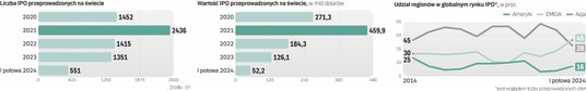 W ostatnich latach na globalnych rynkach statystyki mocno podbijała Azja. Różnica pomiędzy Azją a innymi regionami najbardziej widoczna była w latach 2019–2022 (z wyjątkiem 2021 r., kiedy udział ten krótkookresowo spadł). Na Azję przypadało wtedy aż 60 proc. światowych IPO. W 2022 r. było to rekordowe 63 proc. wobec zaledwie 27 proc. dla regionu EMEIA i 10 proc. dla Ameryk. Te dysproporcje zaczęły się kurczyć w 2023 r., kiedy odsetek IPO zrealizowanych w Azji spadł do 53 proc., a w I połowie 2024 r. do 39 proc. To w dużej mierze efekt zaostrzenia regulacji w Chinach, które mają na celu zwiększenie jakości debiutujących spółek i ochronę interesów inwestorów.