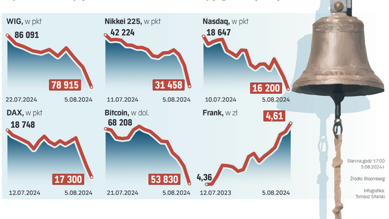 Na światowych rynkach powiało grozą. Słabszy odczyt z amerykańskiego rynku pracy z końcówki ubiegłego tygodnia, który przypomniał o ryzyku recesji gospodarczej w Stanach Zjednoczonych, a także podwyżka stóp procentowych w Japonii, wywołały panikę na giełdach. Fatalne nastroje udzieliły się także inwestorom na warszawskiej giełdzie. Nasz flagowy indeks WIG20 w pewnym momencie poniedziałkowych notowań tracił nawet ponad 5 proc. I chociaż w drugiej części dnia część strat udało mu się odrobić to ostatecznie zamknął jednak dzień 3,1 proc. pod kreską. WIG czyli wskaźnik szerokiego rynku stracił na wartości 3,4 proc. i tym samym w ciągu kilku dni wymazał całość tegorocznych zysków.