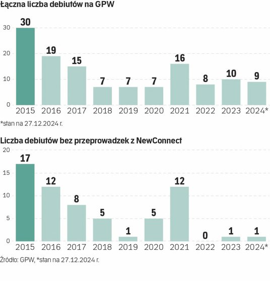 Jedyną spółką, która zadebiutowała w 2024 r. na rynku głównym GPW i przeprowadziła ofertę publiczną, była Żabka (więcej w ramce). W sumie pojawiło się dziewięć firm, ale pozostała ósemka przeniosła się z NewConnect. W całej historii „małej giełdy” na ten krok zdecydowało się już równo 100 firm. W 2025 r. to grono się powiększy. Niestety, na nowych dużych debiutantów spoza NewConnect na GPW na razie nie ma co liczyć.