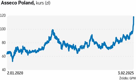 Akcje Asseco są najdroższe od 2000 r. W czwartek na finiszu sesji wyceniono je na 107,4 zł. W piątek, kiedy na rynek trafiła pierwsza informacja o sprzedaży akcji Asseco przez Cyfrowy Polsat na rzecz Yukon Niebieski Kapitał, kurs poszybował. Piątkową sesję zakończył na poziomie 118,3 zł, a w poniedziałek spadał o 1–2 proc., do około 117 zł.