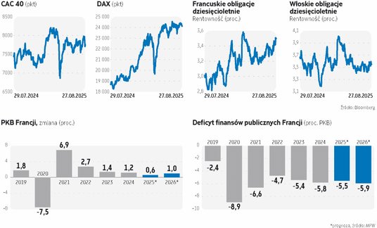 CAC 40, główny indeks giełdy w Paryżu, rósł w środę po południu o 0,5 proc. Lekko więc odrabiał straty po wtorkowej przecenie, ale mimo środowej zwyżki był wciąż o prawie 3 proc. niżej niż na piątkowym zamknięciu. W ostatnich miesiącach słabo się prezentował na tle innych europejskich indeksów giełdowych. Od początku roku zyskał tylko 4,9 proc., podczas gdy niemiecki DAX urósł o 21 proc., włoski FTSE MIB zyskał prawie 25 proc., a polski WIG 20 poszedł w górę o niemal 32 proc. Pod presją znalazły się również francuskie obligacje rządowe. We wtorek po południu ich rentowność sięgała 3,5 proc. i była najwyższa od lutego. Jej poziom sam w sobie nie jest jeszcze niebezpieczny, ale Francja jest coraz bardziej postrzegana przez inwestorów jako „słabe ogniwo” strefy euro. Różnica pomiędzy rentownością jej dziesięciolatek a podobnych papierów włoskich wynosiła we wtorek tylko 8 pb. i stała się najmniejsza od 2005 r. Równocześnie była o 80 pb. wyższa od rentowności niemieckich obligacji dziesięcioletnich Francuskie aktywa znalazły się w niełasce u inwestorów, głównie z powodu kryzysu politycznego i towarzyszących mu obaw o kondycję fiskalną Francji. Obecnemu francuskiemu rządowi, kierowanemu przez Francoisa Bayrou (wysuniętego na to stanowisko przez prezydenta Emmanuela Macrona) grozi upadek. 8 września ma się odbyć w parlamencie głosowanie nad wotum zaufania dla tego gabinetu. Minister finansów Eric Lombard prognozuje, że jeśli Bayrou je przegra, to rentowność francuskich obligacji dziesięcioletnich stanie się wyższa od rentowności takich samych włoskich papierów.