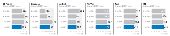 Pod względem osiąganych marż w ścisłej czołówce są producenci gier wideo. W ich przypadku trzeba się jednak liczyć z dużymi wahaniami wyników, co nie pozostaje bez wpływu na marże. Spore różnice dotyczą też samych przedstawicieli branży. Jak przyznają analitycy, o rentowności decyduje niski koszt dotarcia do klienta i rosnące znaczenie cyfrowej dystrybucji gier. Kluczem do zysków są jednak wysokie przychody,które w dużej mierze zależą od sukcesu sprzedaży kolejnych tytułów. Nie bez znaczenia jest model biznesu. W tej branży mamy producentów gier, lecz także spółki, których działalność polega na wydawaniu gier. Najwyższy poziom marży są w stanie generować spółki, które wydają we własnym zakresie produkowane przez siebie tytuły, gdyż nie muszą się dzielić przychodami z zewnętrznym wydawcą. Wydawcą tytułów z własnej grupy kapitałowej jest PlayWay, dzięki czemu jest jednym z liderów w branży pod względem osiąganej marży operacyjnej. Z kolei CD Projekt może się pochwalić względnie wysokim poziomem sprzedaży swoich flagowych tytułów „Wiedźmina” i „Cyberpunka”, zarabiając na sprzedaży kolejnych ich części i dodatków rozszerzających możliwości graczy. Jednocześnie jest w stanie poszerzać bazę potencjalnych graczy udostępniając swoje tytuły na nowych urządzeniach i platformach.
