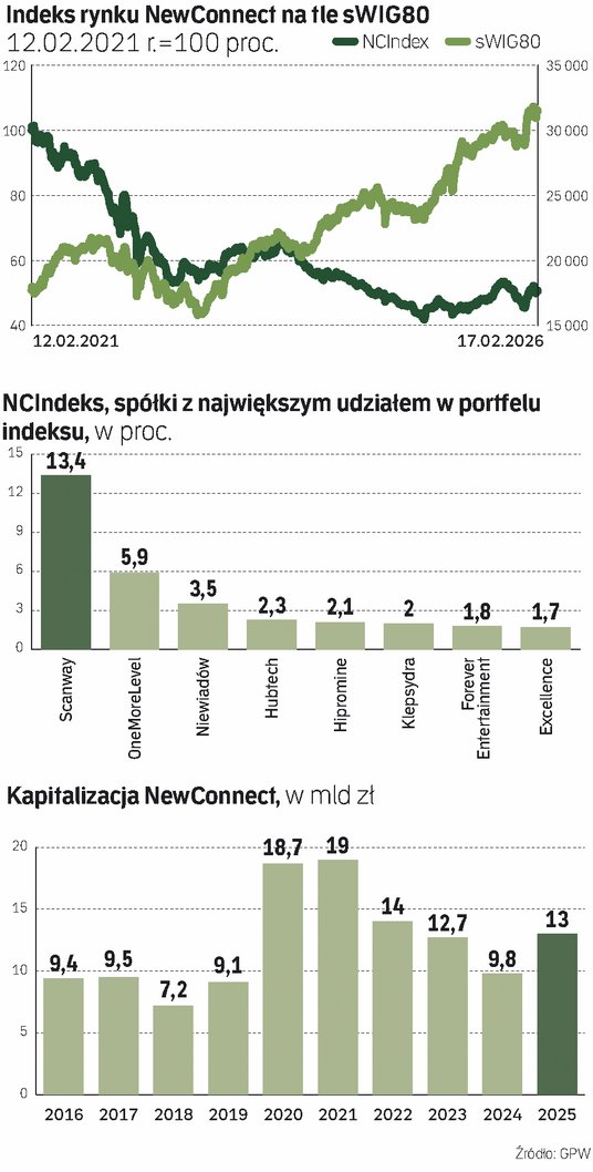 – Historycznie najwyższy poziom środków pieniężnych pozwala nam skutecznie realizować założenia i inwestycje w ramach przyjętej strategii na lata 2026–2028 – mówi Jędrzej Kowalewski, prezes Scanwaya. Spółka w tym roku planuje przenieść się na rynek główny GPW, uszczuplając tym samym kapitalizację NewConnect o kilkaset milionów złotych (obecnie prawie 450 mln zł).