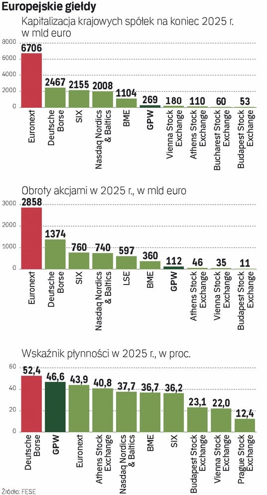 Warszawska giełda w miarę upływu lat rosła w siłę. Przez długi czas punktem odniesienia była dla nas giełda w Wiedniu. Dzisiaj ten wyścig w cuglach wygrywa jednak GPW. W 2025 r. obroty na głównym rynku akcji GPW wyniosły 111,6 mld euro i były ponad dwa razy większe niż w Wiedniu. Kapitalizacja krajowych spółek na koniec 2025 r. sięgnęła w Warszawie 269 mld euro, podczas gdy w Wiedniu było to 180 mld euro. Wskaźnik płynności w ubiegłym roku wyniósł u nas 46,6 proc., podczas gdy w Wiedniu było to 22 proc. Liczby mówią więc same za siebie.
