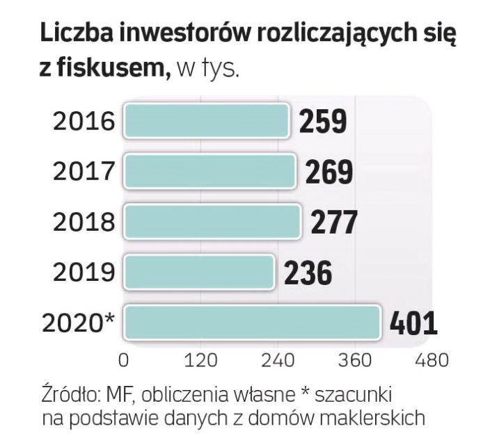 Z szacunków przeprowadzonych na podstawie statystyk zebranych z biur i domów maklerskich wynika, że z aktywności rynkowej w ubiegłym roku będzie musiało rozliczyć się około 401 tys. inwestorów. Ostatni raz tak dobry rok pod tym względem mieliśmy w 2011 r., kiedy to zeznania podatkowe złożyło 411 tys. inwestorów. Wtedy to było jednak jeszcze pokłosie wielkich prywatyzacji.