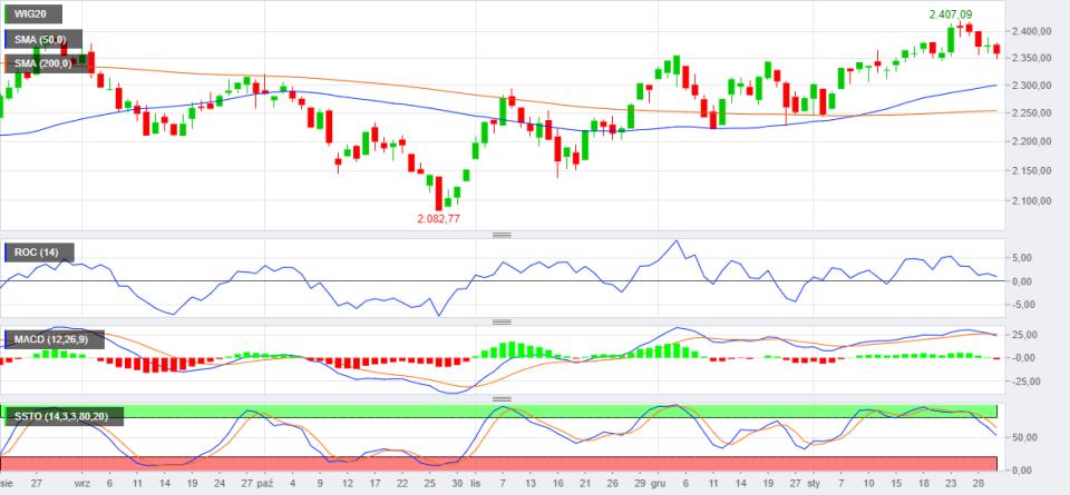 Brytyjski parlament odrzucił we wtorek większość poprawek dotyczących planu opuszczenia Unii Europejskiej, co sprawia, że kwestia brexitu nadal pozostaje dla rynków wielkim znakiem zapytania. Start środowej sesji na GPW pokazał, że niespecjalnie się tym przejmujemy. WIG20 zaczął bowiem z okolic wtorkowego zamknięcia i przez dwie godziny poruszał się horyzontalnie. Problemy zaczęły się przed południem. Notowania ruszyły w dół, pogłębiając co chwilę dzienne minimum. Zniżka nie zbiegła się w czasie z żadną ważną informacją, poza tym indeksy zagraniczne DAX, CAC40 czy nawet RTS zachowywały się znacznie lepiej. Wygląda więc na to, że WIG20 ugiął się pod własnym ciężarem, co wpisuje się w trwającą od kilku dni korektę. Przypomnijmy bowiem, że efekt stycznia wyniósł w ubiegłym tygodniu notowania do najwyższego poziomu od 10 miesięcy czyli 2420 pkt. A po kilku tygodniach regularnej zwyżki, korekta jest czymś naturalnym. Niepokojąco wyglądało tylko to, że indeks naruszył linię trendu wzrostowego, poprowadzoną po dołkach z listopada i grudnia. W porywach indeks spadał w środę do 2348 pkt, ale w końcówce odrobił część strat. Pomogły w tym indeksy z Wall Street, które zaczęły dzień od ponad 0,5-proc. zwyżek. Za oceanem zwyżki napędziły lepsze od oczekiwań dane z rynku pracy (raport ADP), a także lepsze od oczekiwań wyniki kwartalne Boeinga i Apple.