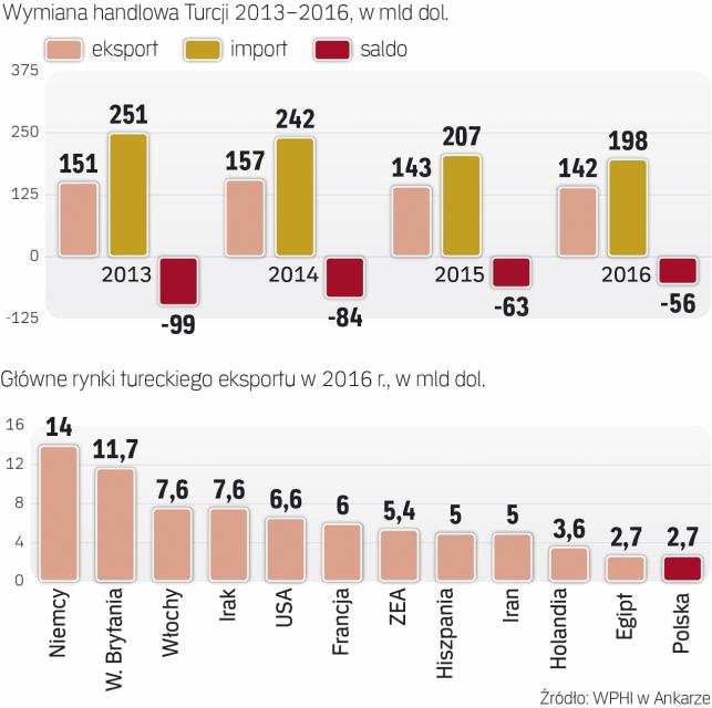 Dziś wymiana handlowa między krajami jest warta ok. 6 mld euro rocznie, a Polska ma minimalnie dodatni bilans. Władze w Ankarze życzyłyby sobie, by obroty sięgnęły 10 mld euro do 2023 r., kiedy będzie setna rocznica ustanowienia republiki nad Bosforem.