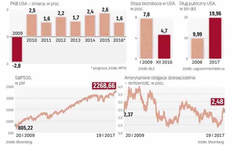 Gdy Barack Hussein Obama obejmował w styczniu 2009 r. władzę, kraj był pogrążony w ciężkiej recesji, a rynki finansowe w panice. Jego rządy przyniosły giełdową hossę i najwolniejsze od 1945 r. ożywienie gospodarcze.