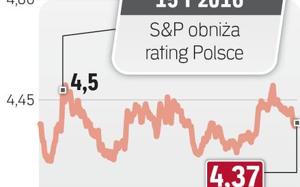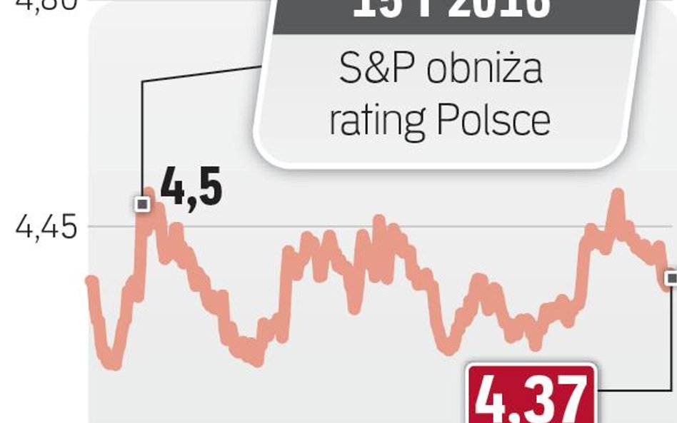Gdy niemal rok temu Standard & Poor's niespodziewanie obniżył długoterminowy rating polskiego długu w walucie obcej do poziomu BBB+ z wcześniejszego A–, złoty mocno się osłabił. W krótkim czasie euro podrożało do 4,5 zł, a frank szwajcarski do 4,13 zł. Szok był duży, bo była to pierwsza obniżka w historii Polski. Wcześniej rating kredytowy Polski jedynie rósł. Standard & Poor's uzasadniał obniżkę uderzeniem rządu w instytucje państwowe, w tym w Trybunał Konstytucyjny, a także zbyt optymistycznymi prognozy co do wzrostu polskiej gospodarki w przyszłości.