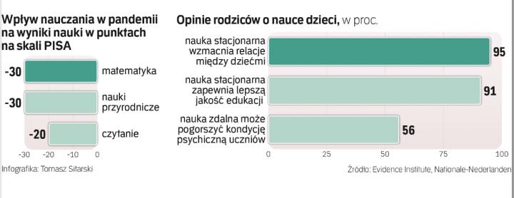 Tę lukę edukacyjną eksperci Evidence Institute wiążą zarówno z wprowadzonymi od 2016 r. zmianami w oświacie (likwidacja gimnazjów), jak i ze stratami podczas nauki w okresie pandemii. – Obydwa efekty są negatywne, choć efekt pandemii jest nieco silniejszy – podkreśla Maciej Jakubowski, współautor badania, który zasiadał w komitecie koordynującym badania PISA. Wpływ Covid-19 widać szczególnie w matematyce i w naukach przyrodniczych, gdzie różnica wynosi ok. minus 30 pkt w skali PISA. Oznacza to utratę roku nauczania.