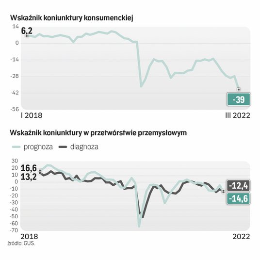 Czy w III kw. też będzie spadek? – Wiele zależy od deeskalacji działań wojennych w Ukrainie – odpowiada Borowski. Analitycy Credit Agricole spodziewają się jej właśnie w III kw. Wtedy spadku aktywności najpewniej by nie było. Nastąpiłoby silne odbicie konsumpcji, która mocno wyhamuje w II kw., a także poprawa nastrojów konsumenckich. Uniknęlibyśmy recesji. – Gdyby jednak działania wojenne przybliżałby się do naszej granicy i rosłoby ryzyko dalszego ich rozlania się, nie można wykluczyć płytkiej recesji – mówi Borowski. Zwłaszcza że nastroje i tak obniża wysoka inflacja i rosnące stopy procentowe.