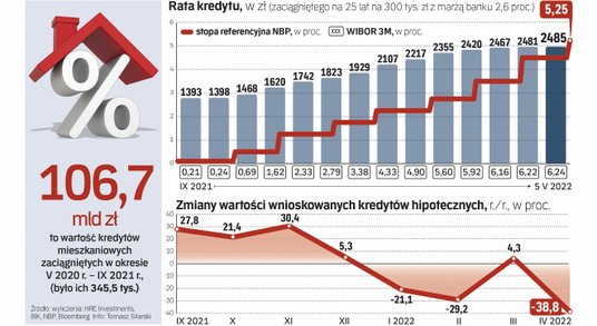 Od jesieni ubiegłego roku niemal każdy przełom miesiąca pogłębia traumę osób z kredytami mieszkaniowymi. Najpierw dowiadują się od GUS o kolejnym skoku inflacji, potem – o podwyżce stóp procentowych przez Radę Polityki Pieniężnej, na koniec – o wyższych ratach kredytu. Ten sam schemat zmącił właśnie nastrój majówki: tuż przed nią informacja o 12,3-proc., najwyższej od niemal ćwierć wieku inflacji, a w czwartek kolejna zła wiadomość dla zadłużonych – podwyżka stóp NBP z 4,5 do 5,25 proc. RPP podnosi stopy regularnie jak w zegarku, bo spóźniona goni za wzrostem cen konsumpcyjnych. Jeszcze we wrześniu stopa referencyjna wynosiła ledwie 0,1 proc.