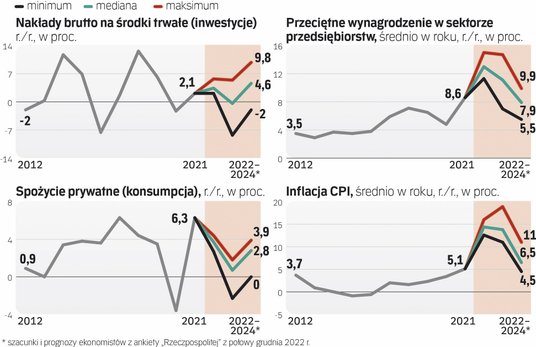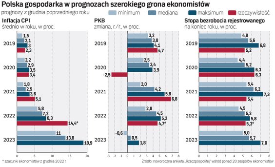 Produkt krajowy brutto Polski, najpopularniejsza miara kondycji gospodarki, zwiększy się w 2023 r. realnie o zaledwie 0,5 proc., po około 4,7 proc. w 2022 r. – takie są, średnio rzecz biorąc, prognozy 27 ankietowanych przez „Rzeczpospolitą” zespołów analitycznych i indywidualnych ekonomistów. Za tą średnią kryją się spore różnice w ocenach. Pesymiści uważają, że PKB zmaleje o około 0,5 proc., optymiści oczekują zwyżki o nieco ponad 1 proc. Ale niezależnie od tego, który z tych scenariuszy się zrealizuje, ten rok zapowiada się jako jeden z najsłabszych po 1995 r. Od tego czasu Polska tylko raz, w naznaczonym pandemią koronawirusa 2020 r., doświadczyła spadku PKB. Najmniejszą jak dotąd zwyżkę tego wskaźnika, o 0,9 proc., GUS odnotował z kolei w 2012 r.