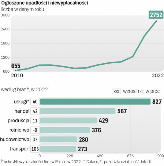W całym 2022 r. niewypłacalność ogłosiły 2752 przedsiębiorstwa, co oznacza wzrost aż o 30 proc. w porównaniu z 2021 r. – pokazuje roczny raport przygotowany przez Coface, który „Rzeczpospolita” i „Parkiet” przedstawiają z wyprzedzeniem. Dane te dotyczą zarówno postępowań sądowych, jak i uproszczonej ścieżki ogłoszenia w Krajowym Rejestrze Zadłużonych.