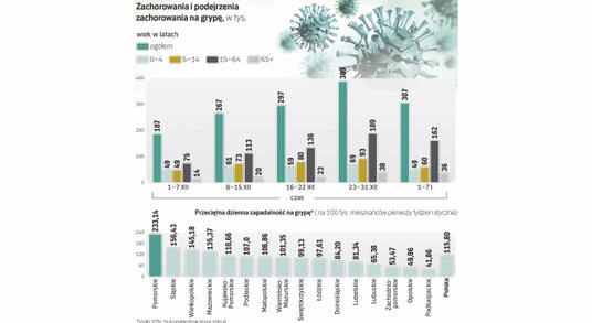 W tym sezonie na grypę zachorowało od października już prawie 2,4 mln osób. Poprzednia rekordowa epidemia miała miejsce sześć sezonów temu – wówczas zachorowało łącznie 4,4 mln osób. Resort zdrowia ma nadzieję, że szczyt zachorowań jest już za nami (w grudniu zdiagnozowano grypę lub podejrzenie o nią u prawie 1,25 mln osób), tym bardziej że w ostatnim tygodniu miesiąca dzieci głównie były w domach, a nie w placówkach oświatowych, ze względu na święta.