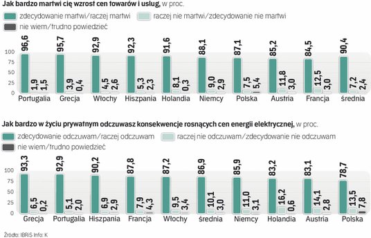 Na pytanie o to, czy boją się wzrostu cen, jedynie 7,7 proc. Europejczyków odpowiada przecząco. Największe obawy wobec inflacji odnotowano w Portugalii. Aż 96,6 proc. odpowiedziało twierdząco na to pytanie. Spokój w obliczu wzrostu kosztów życia odczuwa zaledwie 1,8 proc. Portugalczyków. Jest to najniższy wynik spośród wszystkich państw, w których przeprowadzone zostało badanie. Niewiele lepsze nastroje panują w Grecji, a także Hiszpanii, Holandii i we Włoszech.