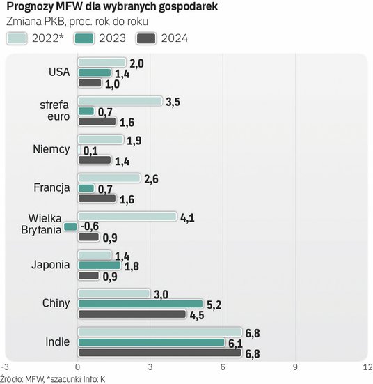 Zastrzegł jednak, że światowa gospodarka będzie się rozwijała w tempie niższym od przedpandemicznej normy (3,8 proc.), a bilans czynników ryzyka każe się liczyć z jeszcze słabszym wynikiem. Hamulcem pozostanie walka z nadmierną inflacją, toczona w wielu ważnych gospodarkach jednocześnie, oraz wojna w Ukrainie.