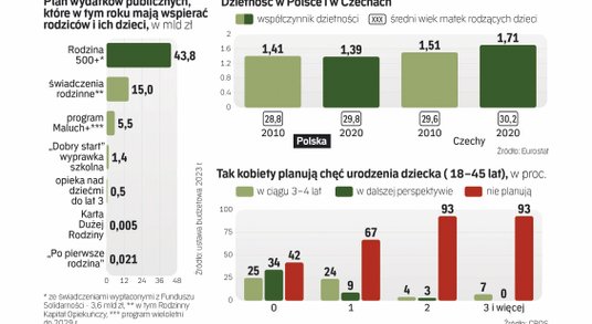 Demografowie wymieniają różne przyczyny, dla których polityka prorodzinna Czech jest skuteczniejsza niż w Polsce. Michał Kot, szef stworzonego przez rząd Instytutu Pokolenie, przypomina raport, który instytut wydał jesienią, „Czeski sukces demograficzny”. Zwraca uwagę na to, iż większość pomocy pieniężnej w Czechach jest przeznaczona dla rodziców dzieci do lat trzech. Jest to przede wszystkim zasiłek rodzicielski, niezależny od dochodów rodziców i przeznaczony dla wszystkich. – Jest on na tyle wysoki, że większość kobiet po urodzeniu dziecka zostaje w domu i je wychowuje, choć dostałaby je także, gdyby poszła do pracy. Konstrukcja świadczenia jest zaś taka, że jeśli kobieta szybko zdecyduje się na kolejne dziecko, to niewykorzystany zasiłek otrzymuje w formie jednorazowej wypłaty, a na kolejne dziecko – kolejne świadczenie – mówi Michał Kot. Zwraca uwagę na to, iż tak jak wskaźnik zatrudnienia kobiet z dziećmi do trzech lat jest jednym z najniższych w Europie, tak w przypadku starszych – najwyższy.