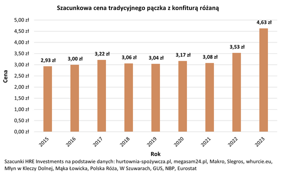 Ile może kosztować wysokiej jakości pączek wykonany według tradycyjnej receptury, czyli taki smażony na smalcu i wypełniony różaną konfiturą? Jak się okazuje taki właśnie pączek powinien w tym roku kosztować 4,63 złotych – wynika z szacunków HRE Investments. Jest to aż o 31 proc. więcej niż rok temu. „W wycenie uwzględniliśmy nie tylko ceny półproduktów (mąki, cukru, mleka, smalcu, drożdży czy różanej konfitury) ale też koszty robocizny, energii, materiałów oraz marżę, z której cukiernik oprócz zysku musi opłacić lokal, utrzymać sprzęt itp. Należy jednak podkreślić, że ze względu na wysokie koszty wytworzenia, niektórzy cukiernicy mogą być zmuszeni do stosowania niższych marż niż w poprzednich latach” – piszą analitycy HRE Investments.