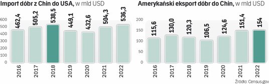 Gdy administracja Joe Bidena obejmowała rządy, zapowiadała odejście od wielu aspektów polityki Trumpa. Wielu analityków zastanawiało się wówczas, jak mocno zmiany te obejmą politykę handlową. Czy dojdzie choćby do obniżki karnych ceł nałożonych na chińskie produkty przez poprzednią administrację? Od tamtej pory w stawkach celnych na dobra z Chin doszło jedynie do kosmetycznych zmian. Z grubsza cła pozostały takie same. Według wyliczeń Instytutu Gospodarki Światowej im. Petersona (PIIE) w styczniu 2018 r. średnie amerykańskie cło na chińskie produkty wynosiło 3,1 proc. Później administracja Trumpa je stopniowo podnosiła, aż do poziomu 21 proc. we wrześniu 2019 r. W 2020 r., w ramach umowy handlowej tzw. pierwszej fazy, spadło ono do 19,3 proc. I na takim poziomie pozostaje do dzisiaj. Średnie chińskie cło na amerykańskie produkty wzrosło natomiast z 8 proc. w styczniu 2018 r., do 21,8 proc. we wrześniu 2019 r. Po umowie handlowej pierwszej fazy spadło do 21,3 proc. Później było dwukrotnie obniżane o 0,1 pkt proc. – za pierwszym razem w lipcu 2020 r., za drugim w maju 2022 r. wynosi więc obecnie 21,1 proc. Amerykańskimi cłami jest objęte 66,4 proc. towarów sprowadzanych z Chin, a chińskimi 58,3 proc. dóbr importowanych z USA. Nic się pod tym względem nie zmieniło od września 2019 r.