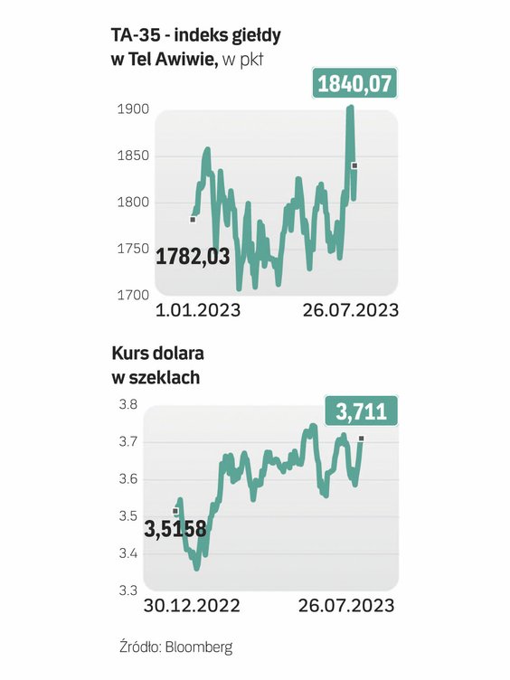 Izraelskie aktywa w środę częściowo odrabiały straty po silnej przecenie z wtorku. TA-35, czyli indeks giełdy w Tel Awiwie, rósł po południu o blisko 2 proc., po tym jak dzień wcześniej stracił 3 proc. Szekel zyskiwał po południu 0,3 proc. wobec dolara (notowania wynosiły 3,69 szekli za 1 USD), ale był i tak słabszy o ponad 2 proc. niż na koniec zeszłego tygodnia. Od początku roku stracił już ponad 5 proc. wobec dolara. W czerwcu notowania szekla dochodziły do 3,755 za 1 USD. Izraelska waluta była wówczas najsłabsza od marca 2020 r. I niewiele jej do takiego poziomu brakuje.