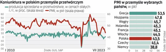 Już od maja ub.r. PMI nad Wisłą utrzymuje się wyraźnie poniżej 50 pkt, co teoretycznie oznacza, że koniunktura w przemyśle przetwórczym pogarsza się w ujęciu miesiąc do miesiąca. Dystans od tej granicy to miara tempa tego pogorszenia. W tym świetle w lipcu recesja w przemyśle, która wiosną zdawała się odpuszczać, wyraźnie się pogłębiła.