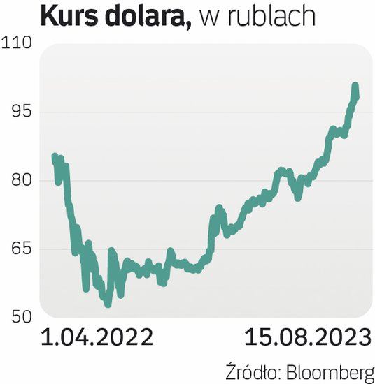 Rosyjska waluta nie była tak słaba od okresu rynkowej paniki towarzyszącej pierwszemu miesiącowi pełnoskalowej inwazji na Ukrainę (choć podczas czerwcowego buntu Grupy Wagnera rosyjskie banki kupowały dolara po ponad 100 rubli, ale było to przejawem krótkotrwałej niepewności i nie zostało uwzględnione w oficjalnych notowaniach). Od początku roku rubel stracił ponad 25 proc. wobec dolara, co plasowało go w tym czasie w gronie najgorszych walut świata. Przez 12 miesięcy tąpnął o blisko 40 proc., czyli zniżkował bardziej niż choćby lira turecka i funt egipski, a nieco mniej niż nigeryjska niara.